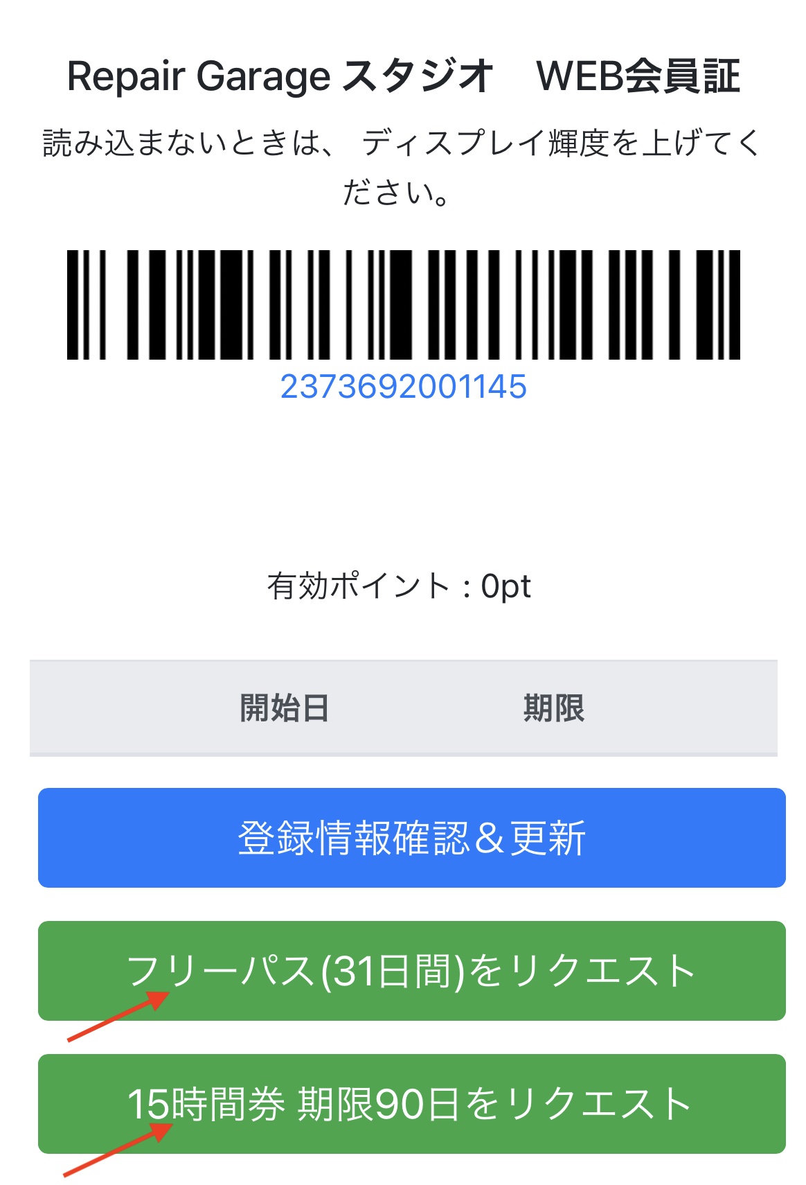 3.フリーパスか回数券、ご希望のプランでリクエストをタップします。これで店舗にリクエストが送信されます。